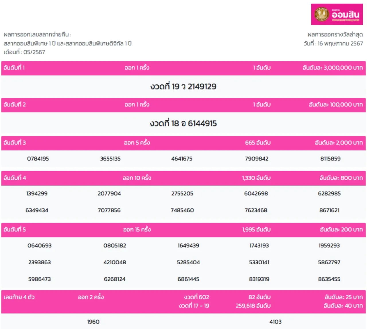 ผลสลากออมสิน "พิเศษ 1 ปี" งวดวันที่ 16 พฤษภาคม 2567